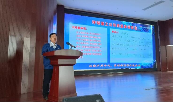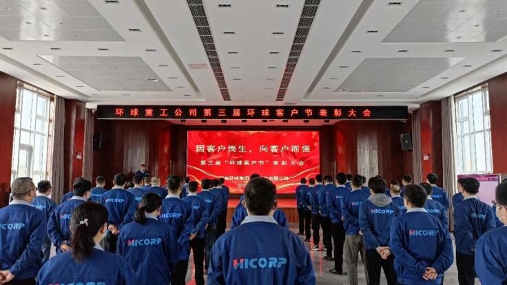 2022 年 4 月 28 日上午 8:30,環(huán)球重工“因客戶而生,向客戶而強”第三屆環(huán)球客戶節(jié)表彰大會在集團總部多功能廳舉行。環(huán)球重工總經(jīng)理劉增喜出席大會并發(fā)表講話。大會由副總經(jīng)理張金鐫主持,環(huán)球重工全體中層干部、售后服務代表等 60 余人參加。